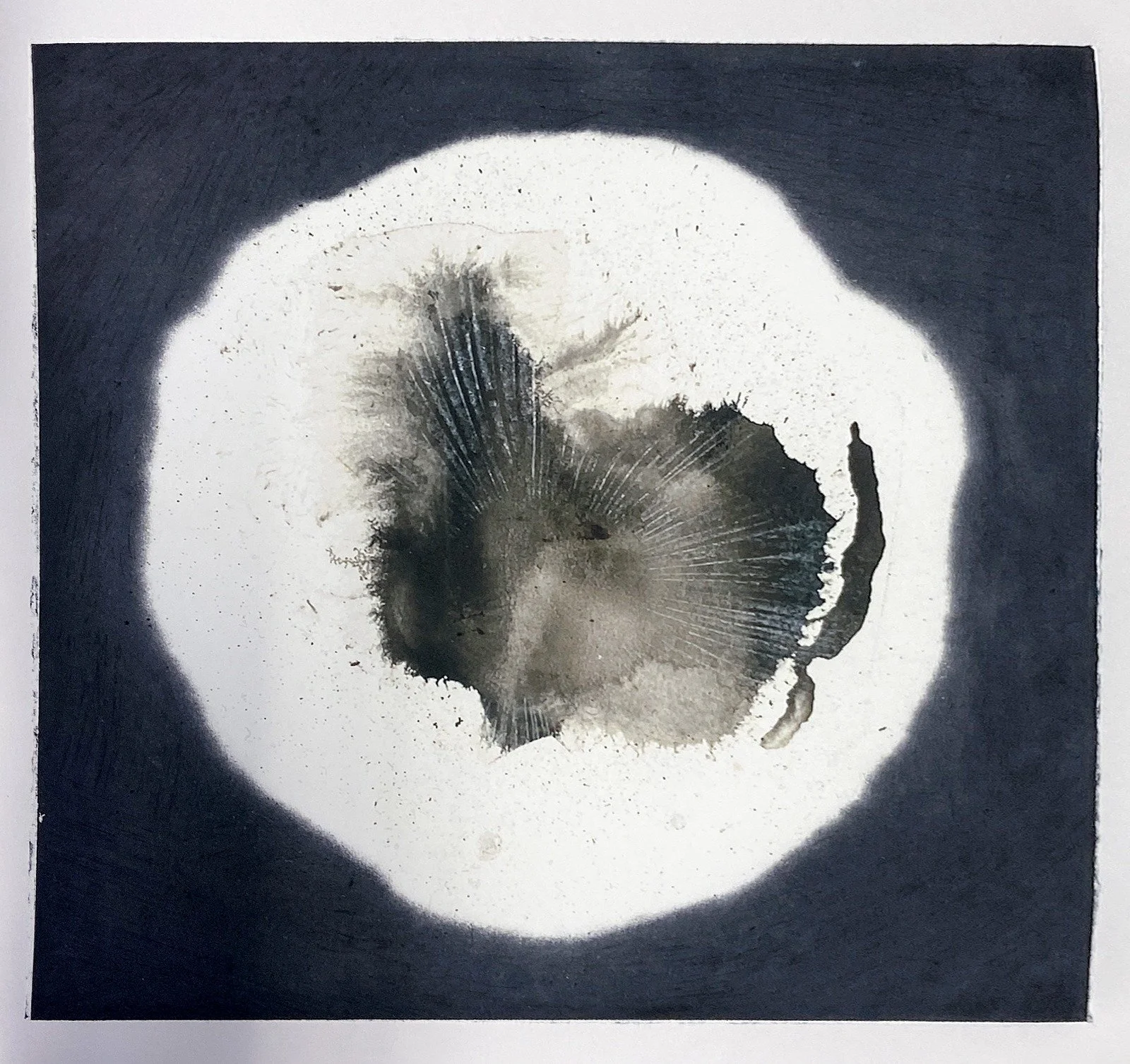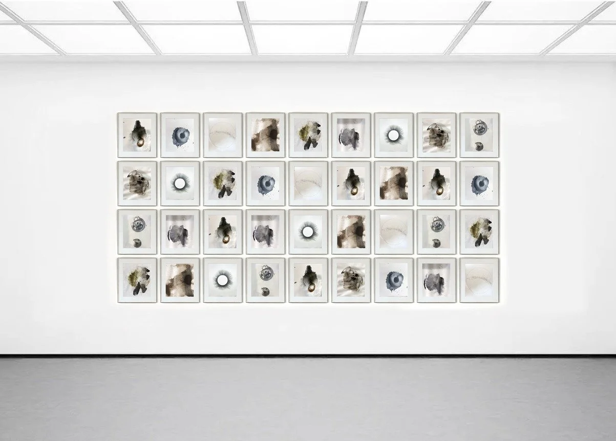SOLAR GAZE, A painting series, created using pigment made from charred bone of over 1000 species. Solar black; drawing on Japanese paper.