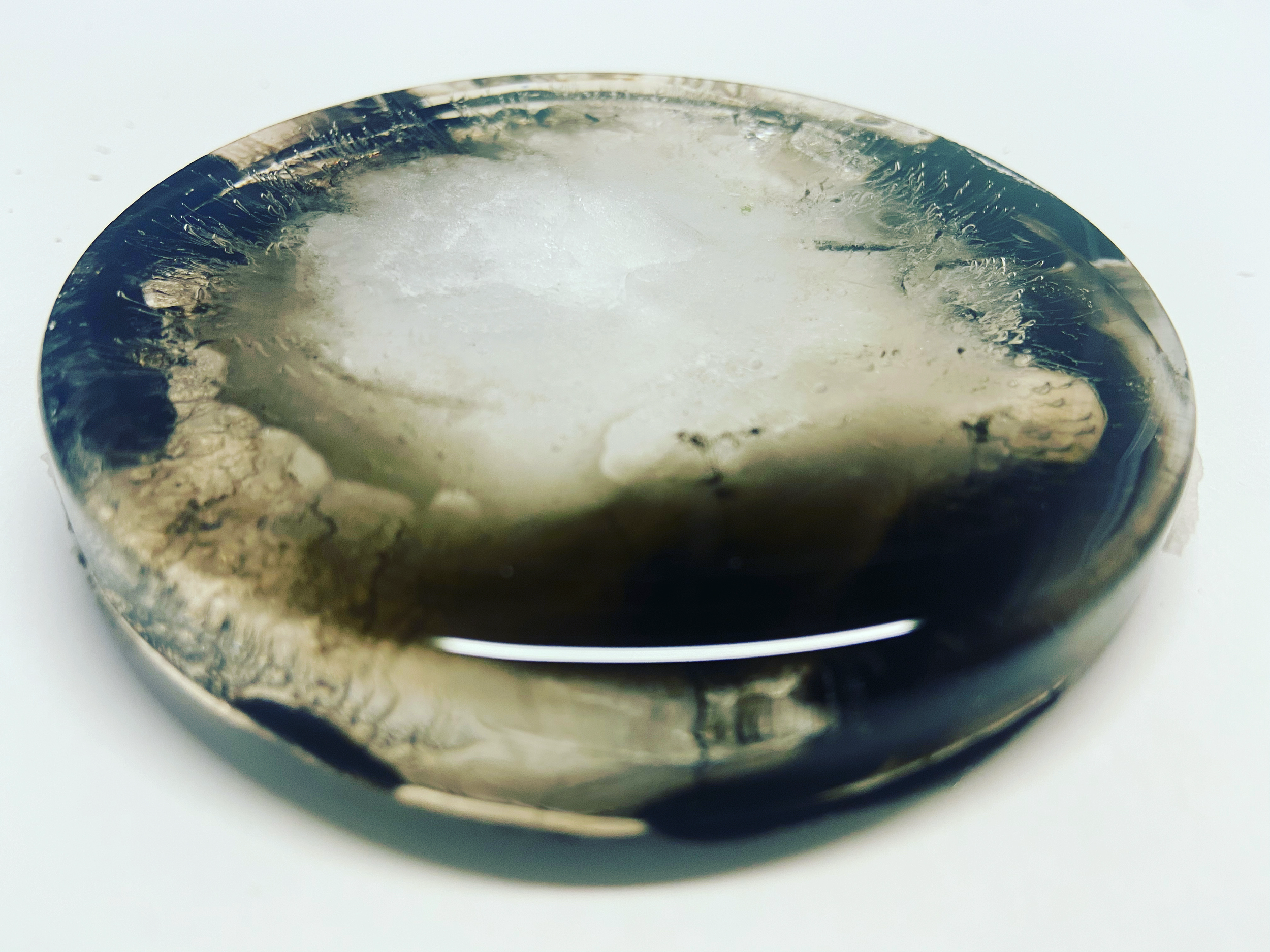 STUDY FOR A VOLCANO (2020) Study for a volcano’ (2020) Eyjafjallajökull 2010 eruption film through glass prism, 2:20 mins a glass prism embellished with volcanic ash, air particles and 24 karat gold.