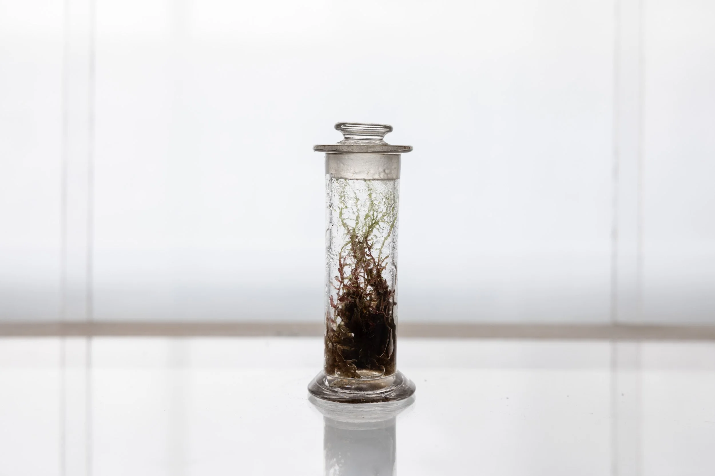 Is a slow distillation of deep time created from plants and mineral rich bog waters, that explores links between smell & memory. The installation holds an assortment of hand blown glass bottles containing scent from eight of the most important notes. Some of the vessels contain scent infused remnants that were buried deep in a bog for over 20 years alluding to the low oxygen levels and unusual smells derived from the preservation conditions. The artwork employs the senses to cultivate an intimate, intuitive experience that aims to transport participants through time as a reminder of the medicinal properties in the pharmacy beneath our feet.